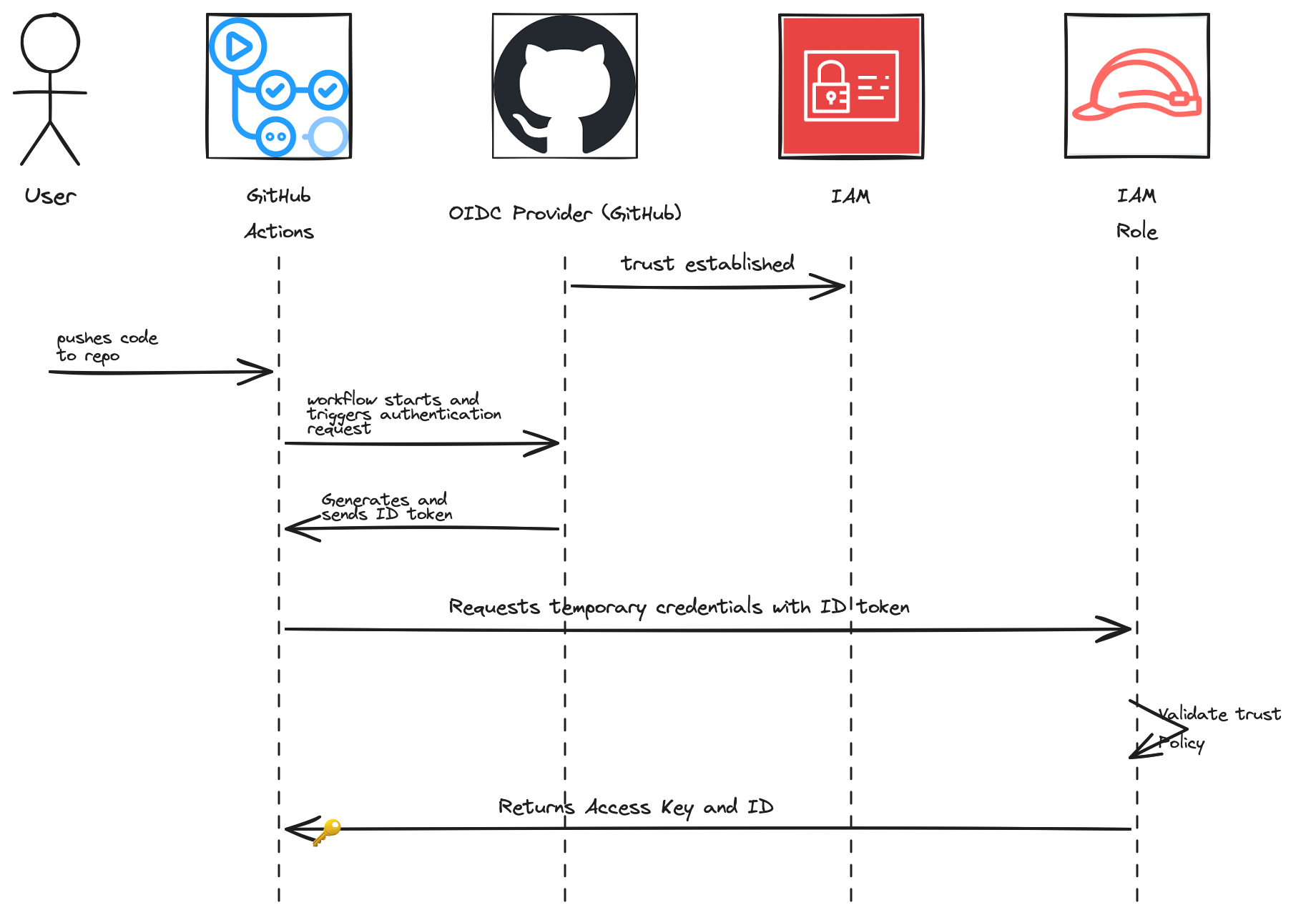 There's a better approach - OpenID Connect (OIDC) lets GitHub Actions authenticate to AWS without any stored secrets. Each workflow run gets short-lived credentials that expire when the job ends. No keys to rotate, no secrets to leak, and a clear audit trail tying every AWS action to a specific workflow run.